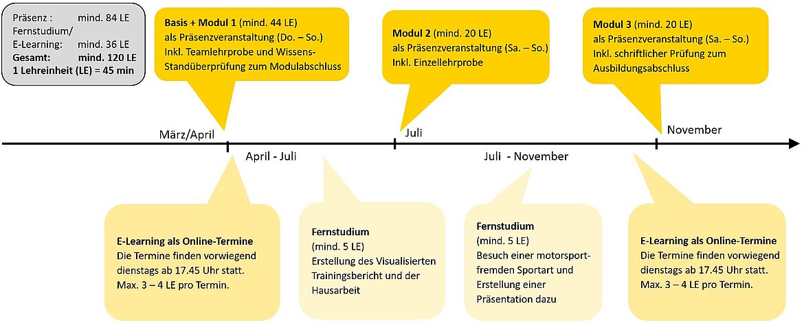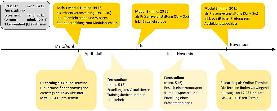 Es werden in den einzelnen Modulen unterschiedliche Themenbereiche gemäß der Ausbildungsrichtlinie für DOSB Trainer*in im Motorsport bearbeitet, welche aufeinander aufbauen. Bespielhaft sind hier genannt Sportpädagogik, Sportorganisation, Trainingslehre, Sportmedizin, Anti Doping Richtlinien, Gewaltprävention.